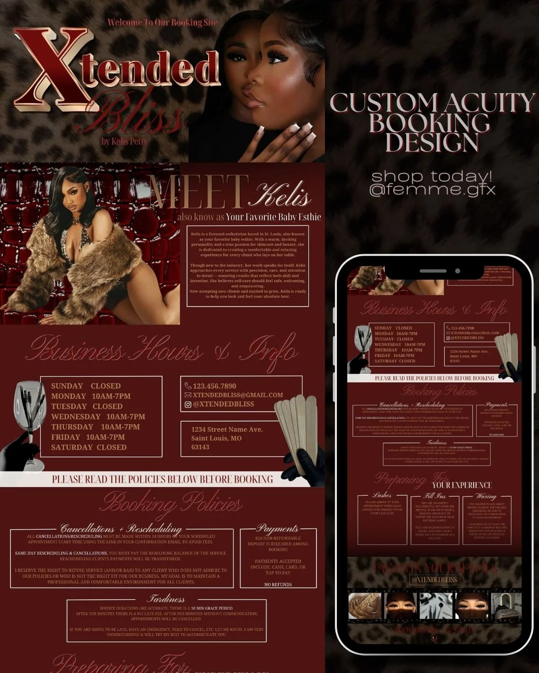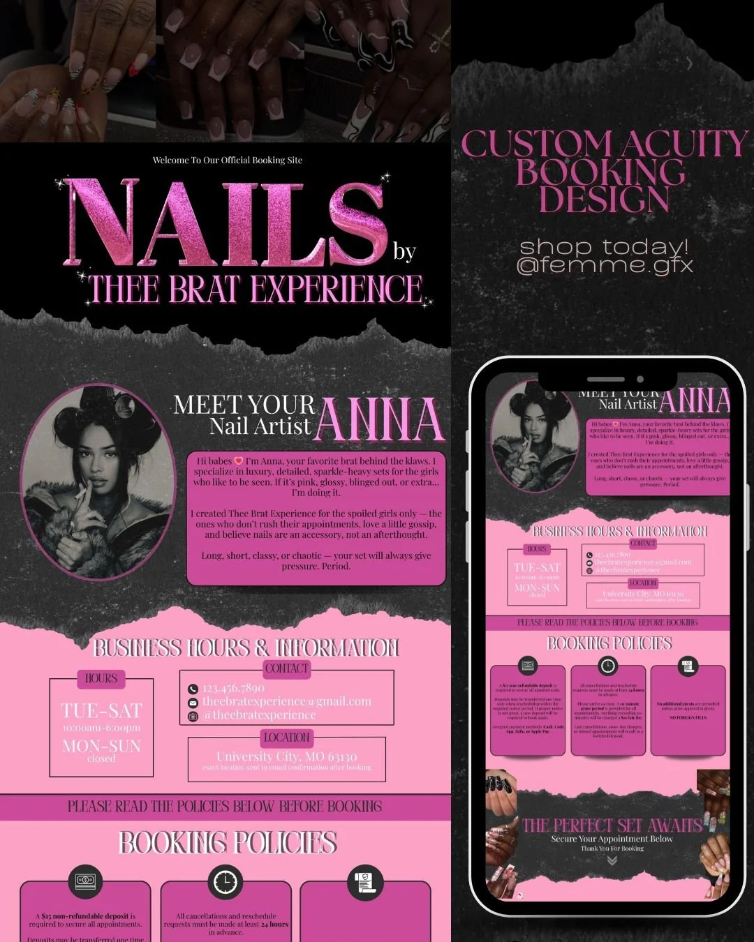 Welcome to Femme.gfx, where vision meets design in the softest, most intentional way. This is the space where mood boards become meaningful brands, thoughtfully curated, professionally executed, and tailored to reflect your unique aesthetic. From custom Acuity sites and Squarespace builds to elevated logos, Femme.gfx offers refined design solutions for modern businesses ready to show up beautifully.